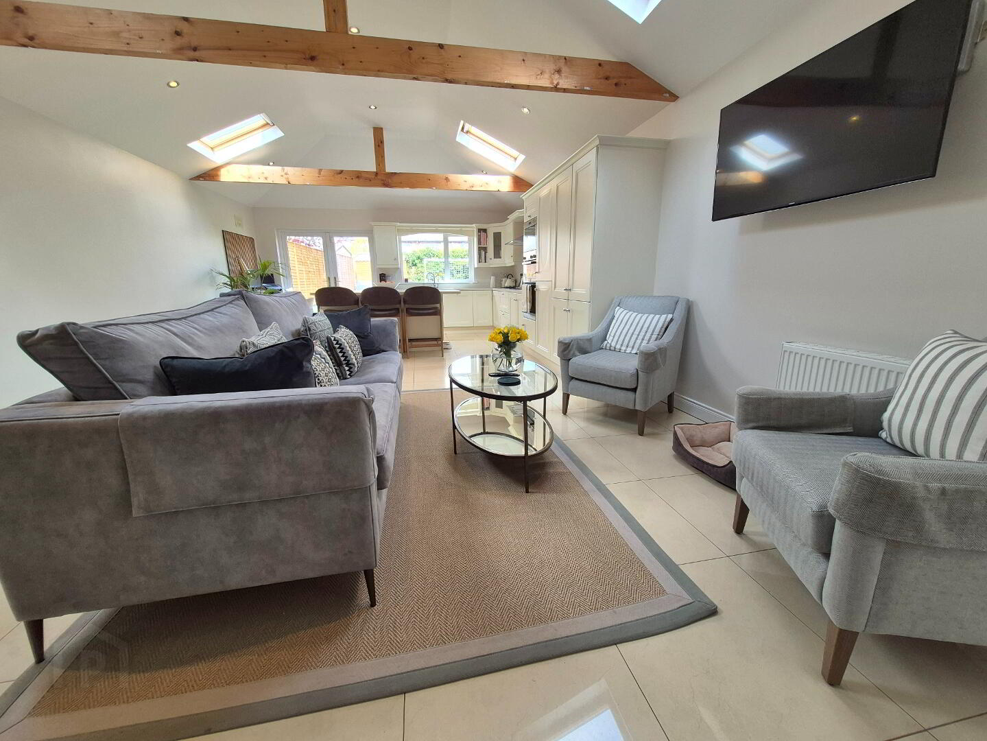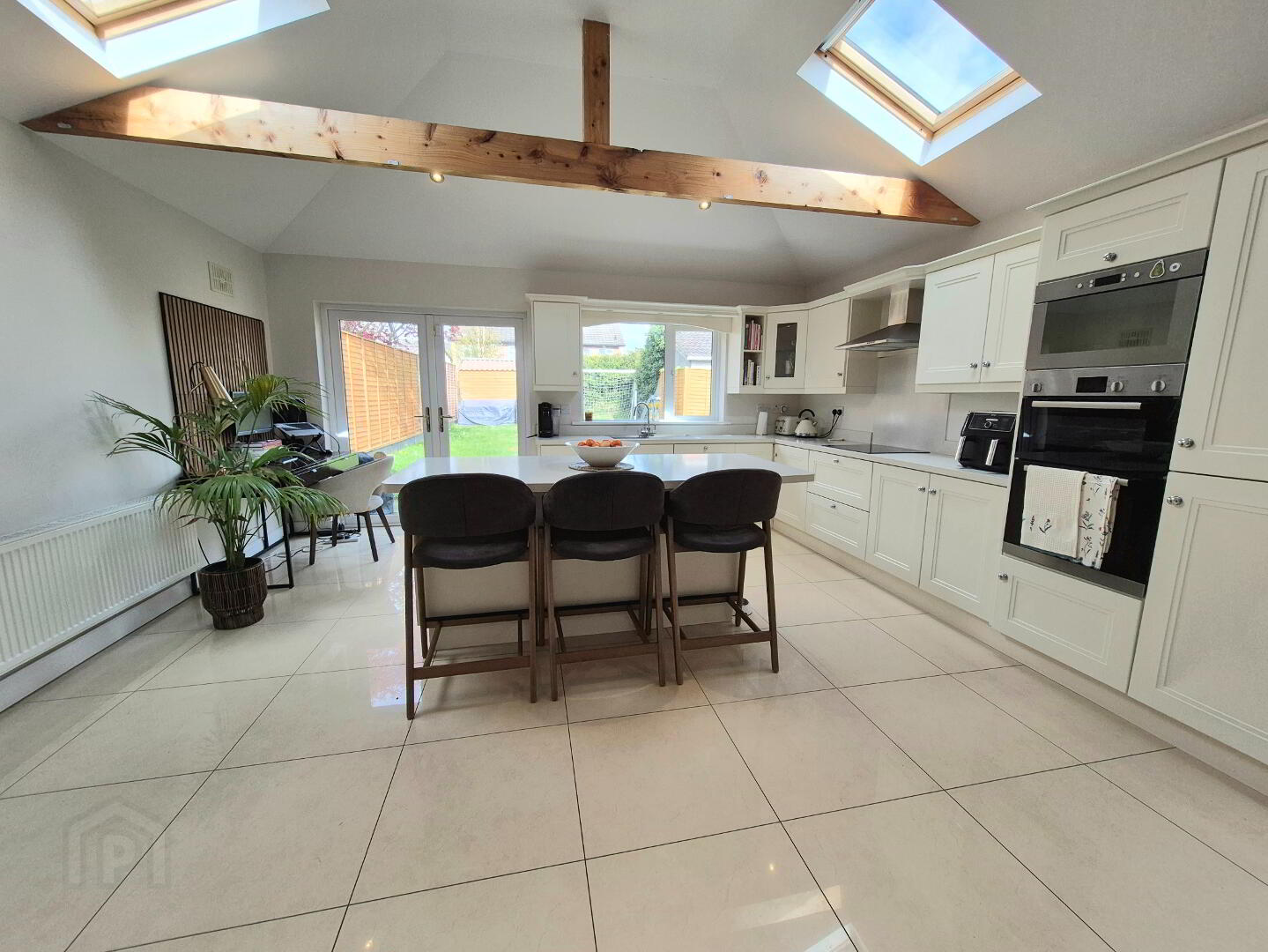 Sitting room - 5.0m x 3.63m Laminate wood floor, feature open fireplace, double doors to kitchen Kitchen/living room - 5.1m x 11.04m Tiled floor, vaulted ceiling with 4 velux windows, exposed timber beams, fitted cream kitchen units, breakfast island, french doors to garden.
