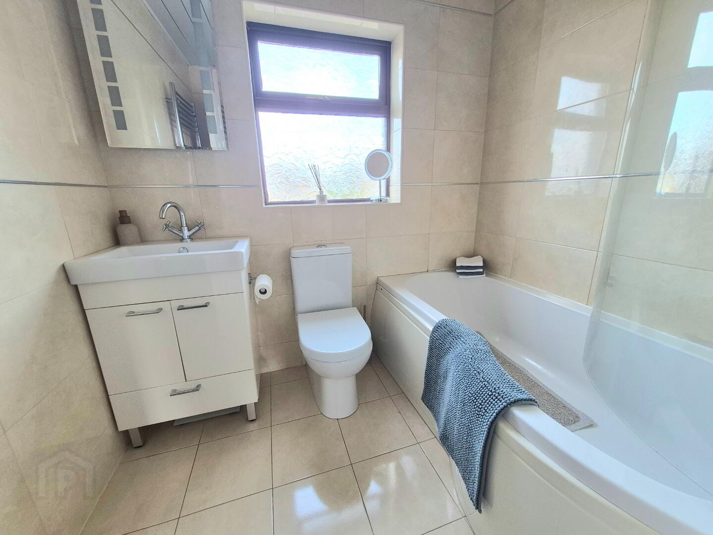 Bathroom - 2.13m x 2.26m bath with electric shower, wc, whb, fully tiled, towel heater, spotlights.